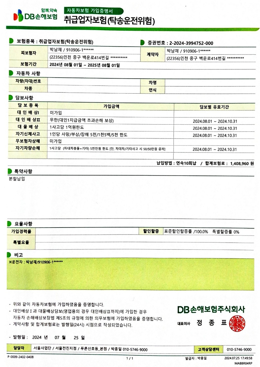 취급자보험(탁송운전위험)
